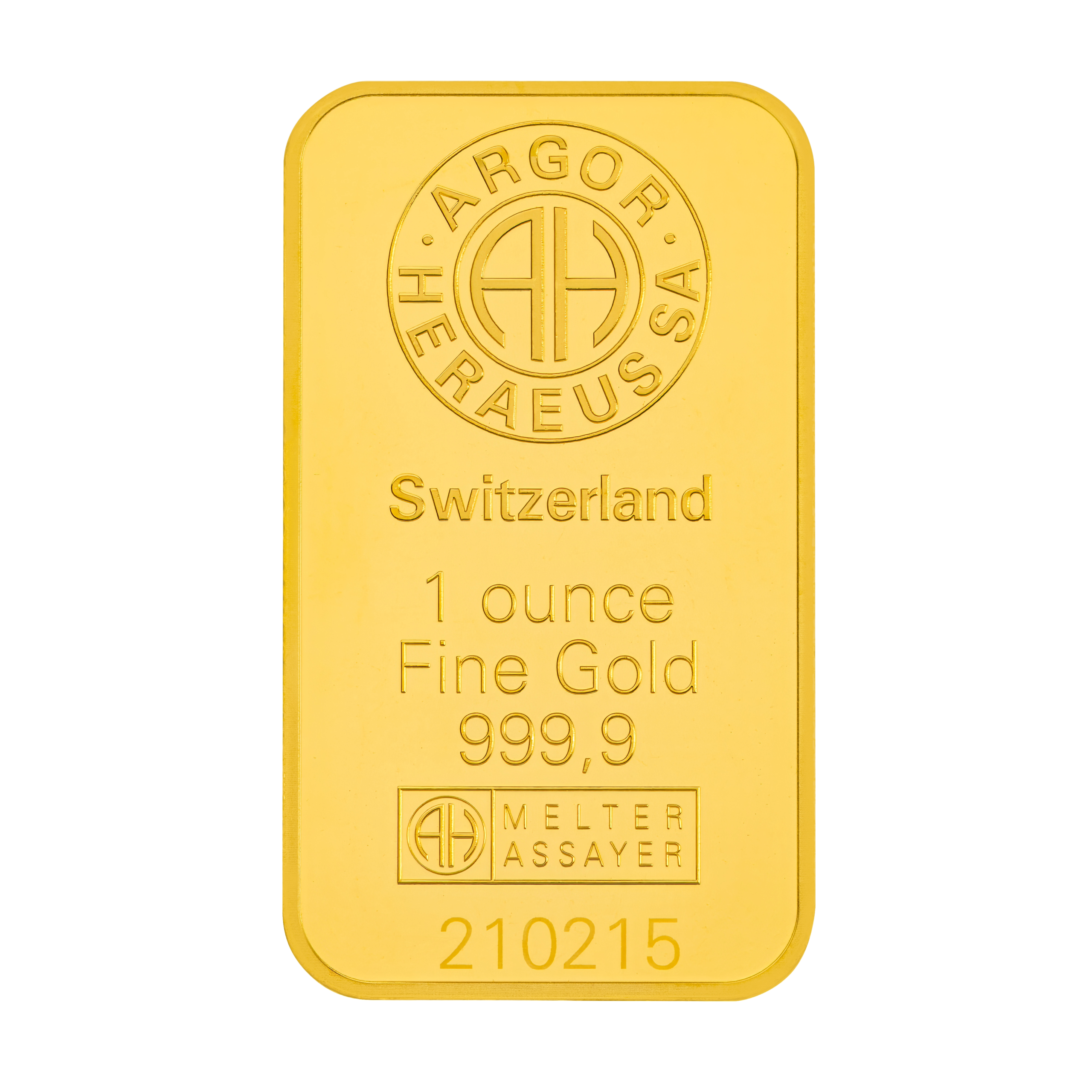 1 uns 24 karat (999,9) guldtacka från Schweiziska Argor-Heraeus, LBMA-certifierad.