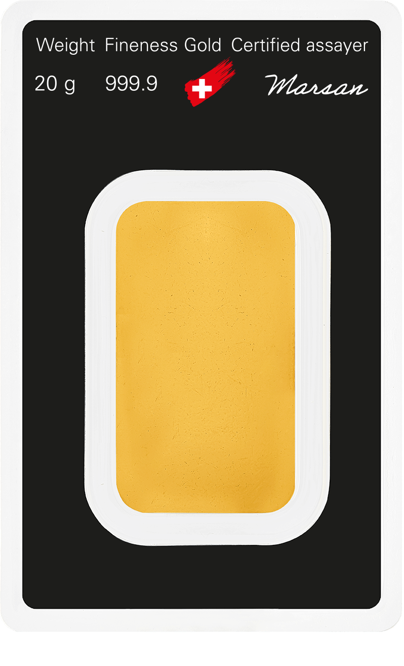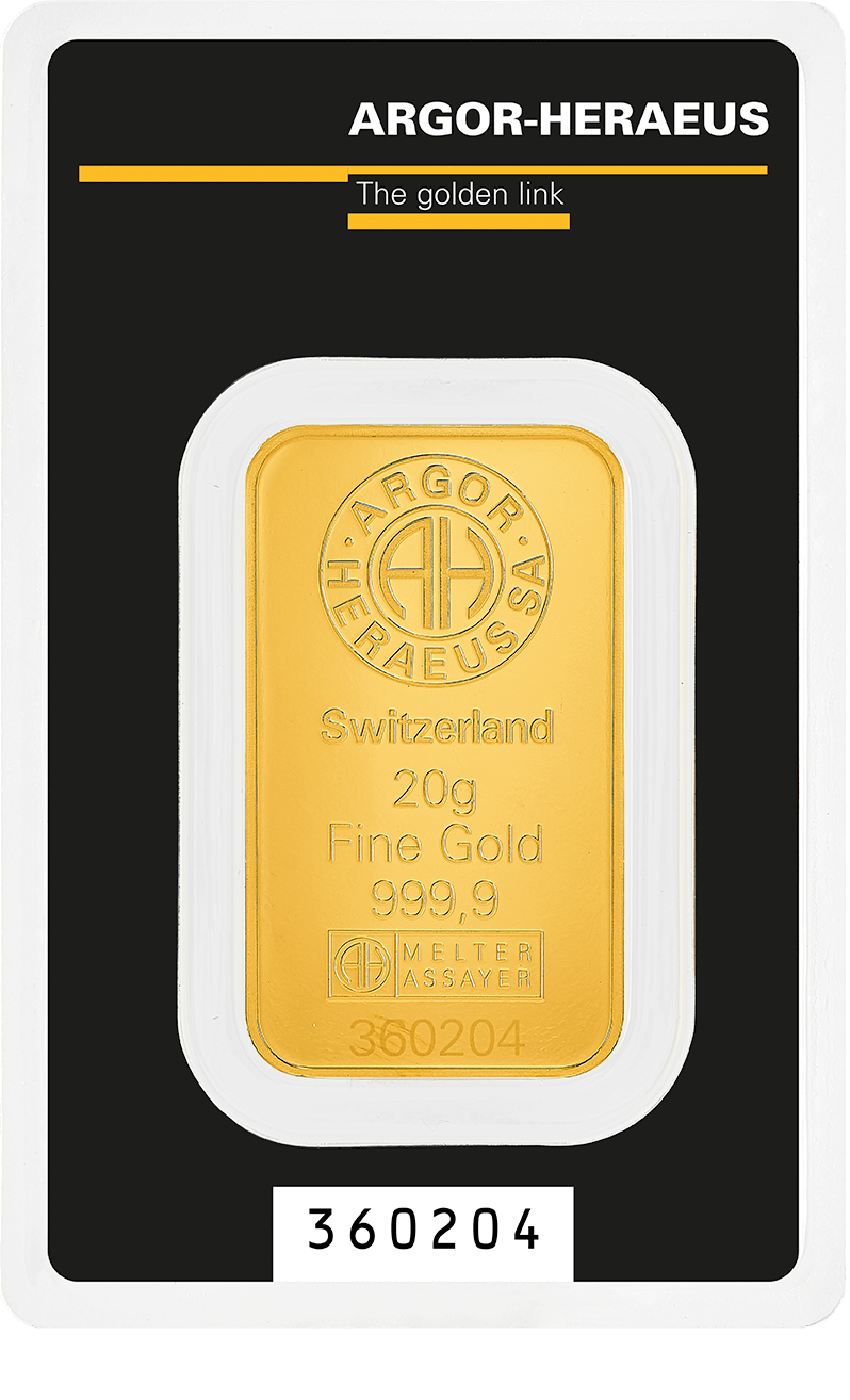 20 gram 24 karat (999,9) guldtacka från Schweiziska Argor-Heraeus, LBMA-certifierad.
