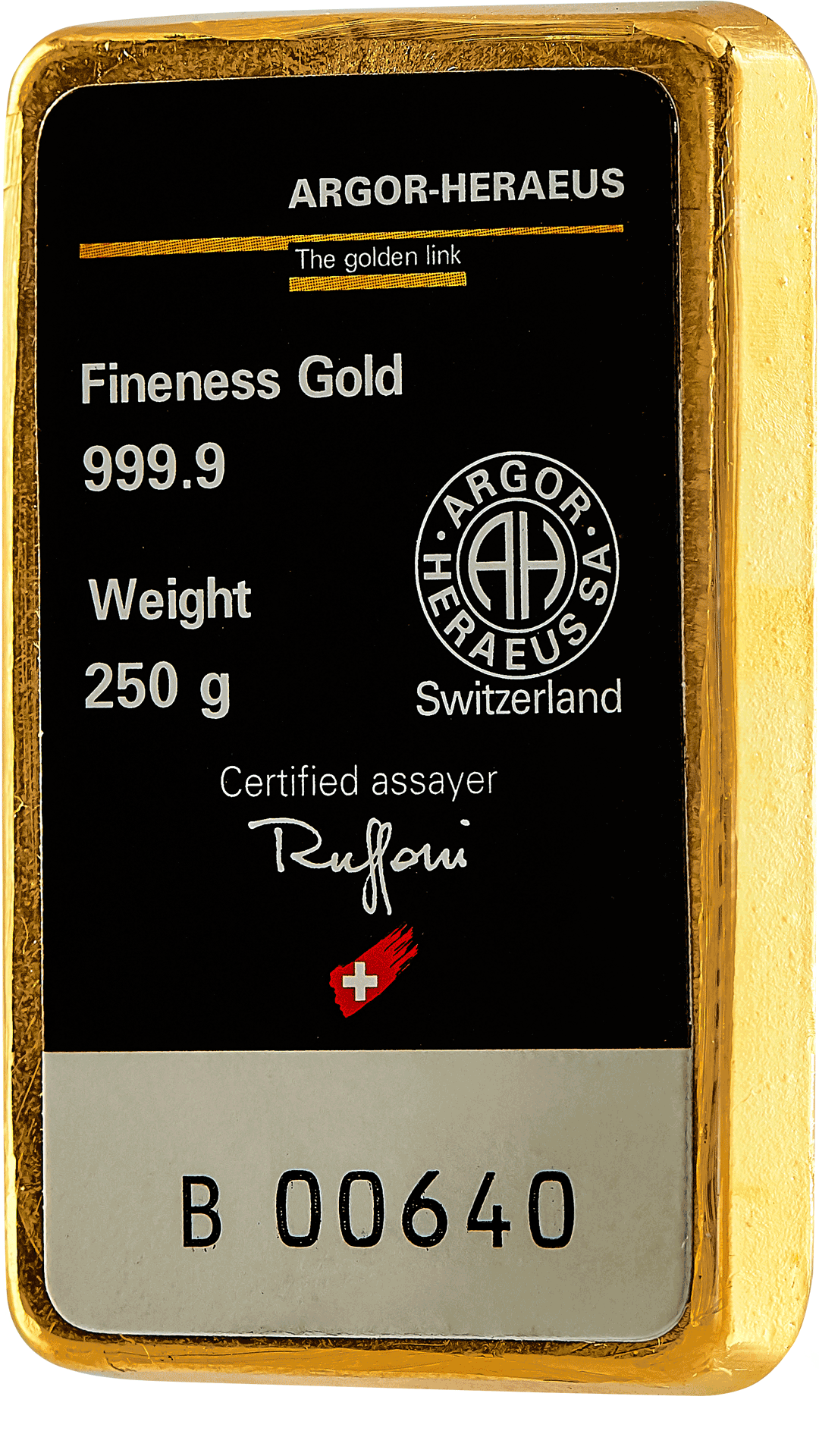 250 gram 24 karat (999,9) guldtacka från Schweiziska Argor-Heraeus, LBMA-certifierad.